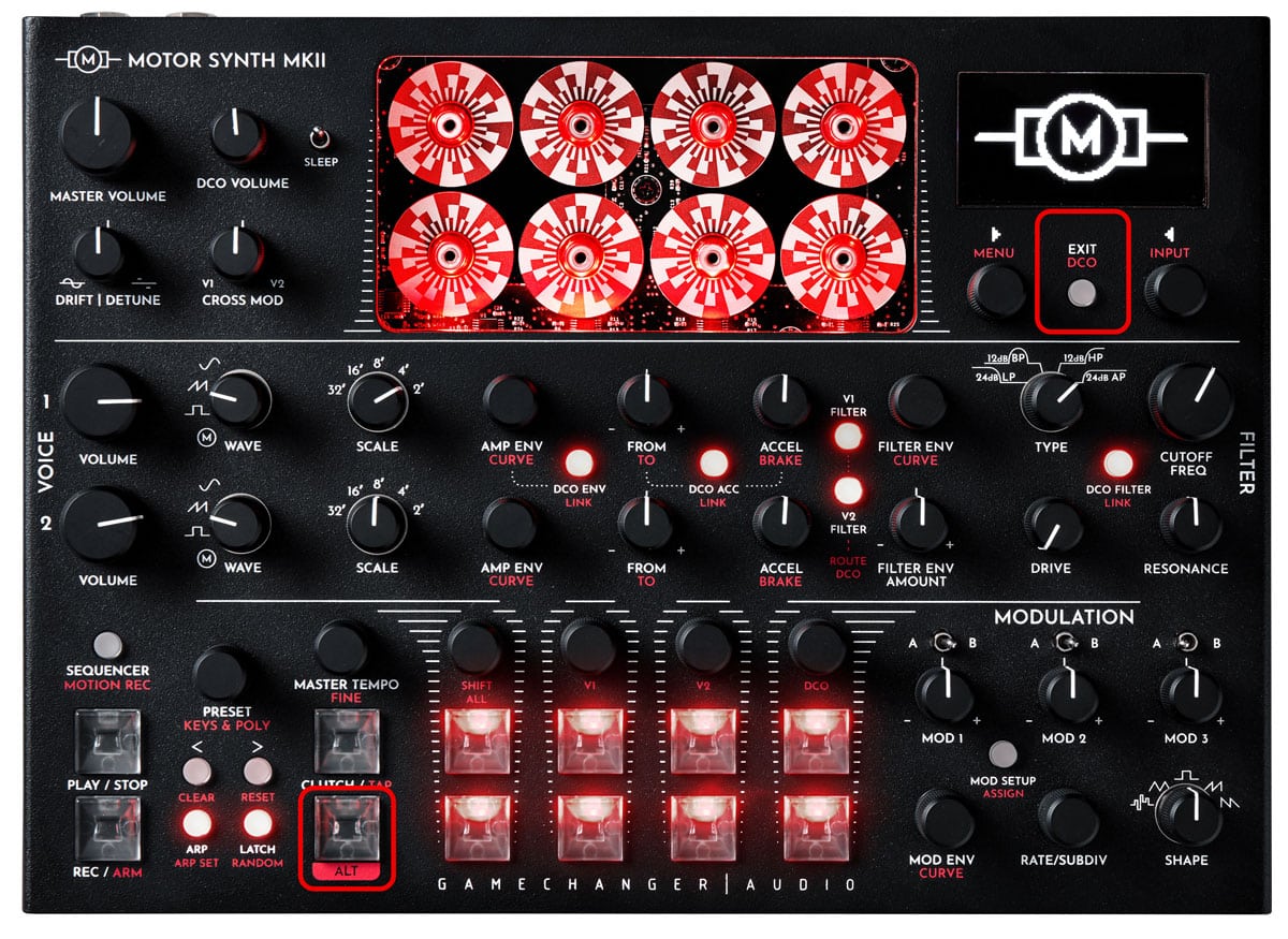 The DCO is controlled with a dedicated DCO VOLUME knob in the MASTER section on the front panel. Additional wave-shaping parameters can be adjusted in the DCO SCREEN with the ▷ LEFT & ◁ RIGHT SCREEN ENCODERS. To access the DCO screen push the ALT + EXIT / DCO button below the screen.